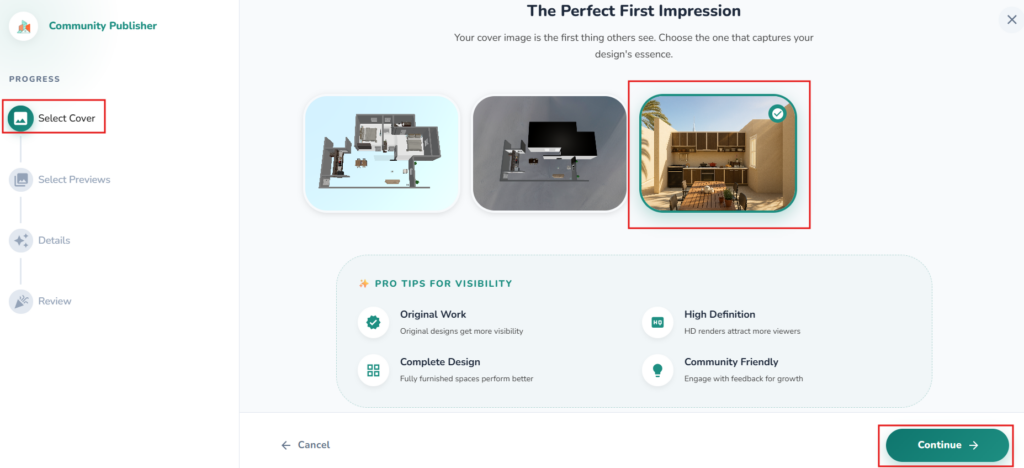 Carefully review your publication details to ensure every render and description is exactly as you intended. Select who can see your Design template: Public/Private/View only.